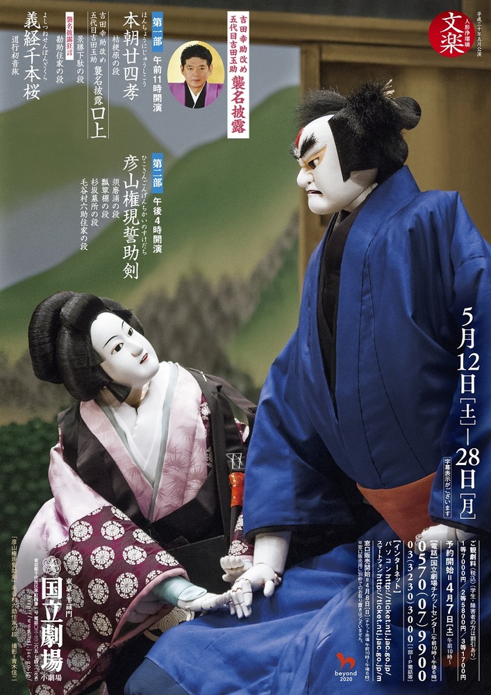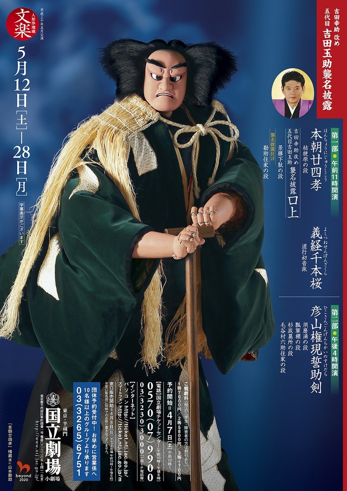 | 演目内容 | ■第1部 本朝廿四孝(ほんちょうにじゅうしこう) ・桔梗原の段 吉田幸助改め 五代目吉田玉助 襲名披露 口上 ・景勝下駄の段 襲名披露狂言 ・勘助住家の段 義経千本桜(よしつねせんぼんざくら) ・道行初音旅 ■第2部 彦山権現誓助剣(ひこさんごんげんちかいのすけだち) ・須磨浦の段 ・瓢簞棚の段(中) ・杉坂墓所の段 ・毛谷村六助住家の段 |