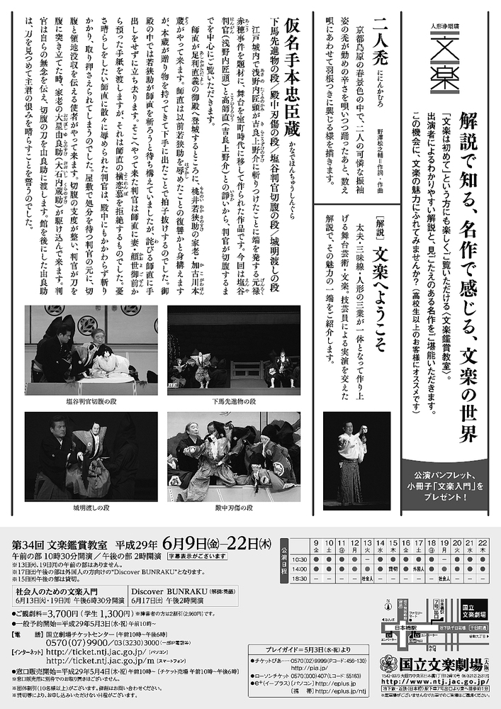 | 演目内容 | (午前の部 午後の部共通) 二人禿 (ににんかむろ)(9〜15日 二枚目) 文楽へようこそ(9〜15日午前の部、16〜22日午後の部) 仮名手本忠臣蔵 (かなでほんちゅうしんぐら) ・下馬先進物の段(16〜22日) ・殿中刃傷の段 ・塩谷判官切腹の段 ・城明渡しの段 社会人のための文楽入門・Discover BUNRAKU 二人禿(ににんかむろ) 解説 文楽のいろは 構成=木ノ下 裕一 [ご案内] 茂山 童司(13日) 仮名手本忠臣蔵(かなでほんちゅうしんぐら) ・下馬先進物の段(17・19日) ・殿中刃傷の段 ・塩谷判官切腹の段 ・城明渡しの段 13日(火)・19日(月)は、午後の部のみ、17日(土)は午前の部のみ 全日程で中学生・高校生等の団体観劇があり、平日は学校団体で満席の場合もございます 13日(火)・19日(月)は、午後6時30分開演の「社会人のための文楽入門」がございます 17日(土)午後の部は外国人の方向けの「Discover BUNRAKU」となります |