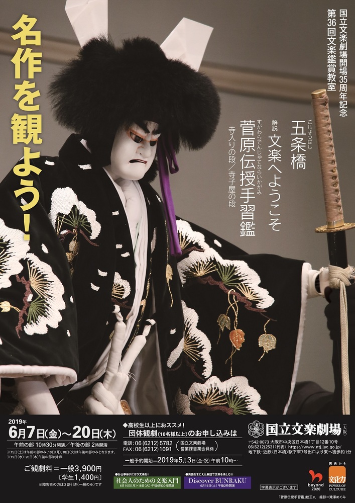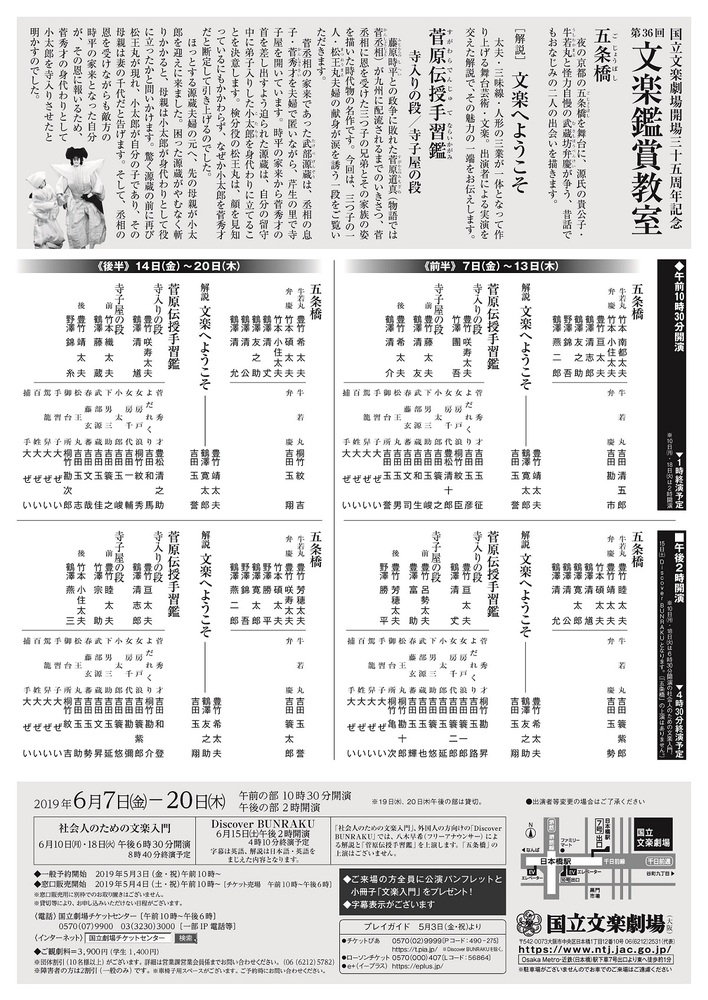 | 演目内容 | (午前の部 午後の部共通) 五条橋(ごじょうばし) 解説 文楽へようこそ 菅原伝授手習鑑(すがわらでんじゅてならいかがみ) ・寺入りの段 ・寺子屋の段 社会人のための文楽入門・Discover BUNRAKU 解説 文楽のいろは [ご案内] 八木早希 菅原伝授手習鑑(すがわらでんじゅてならいかがみ) ・寺入りの段 ・寺子屋の段 *「五条橋」の上演はございません。 10日(月)・18日(火)は、午後の部のみ、15日(土)は午前の部のみ 全日程で中学生・高校生等の団体観劇があり、平日は学校団体で満席の場合もございます 10日(月)・18日(火)は、午後6時30分開演の「社会人のための文楽入門」がございます 15日(土)午後の部は外国人の方向けの「Discover BUNRAKU」となります |