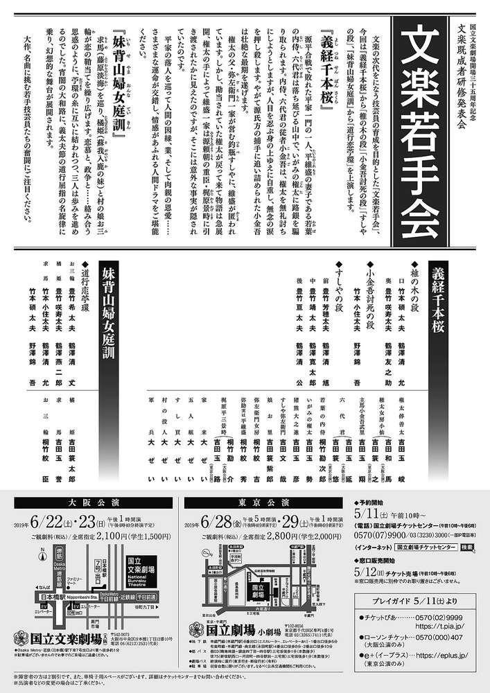| 演目内容 | 義経千本桜 (よしつねせんぼんざくら) ・椎の木の段 ・小金吾討死の段 ・すしやの段(中) 妹背山婦女庭訓 (いもせやまおんなていきん) ・道行恋苧環 |